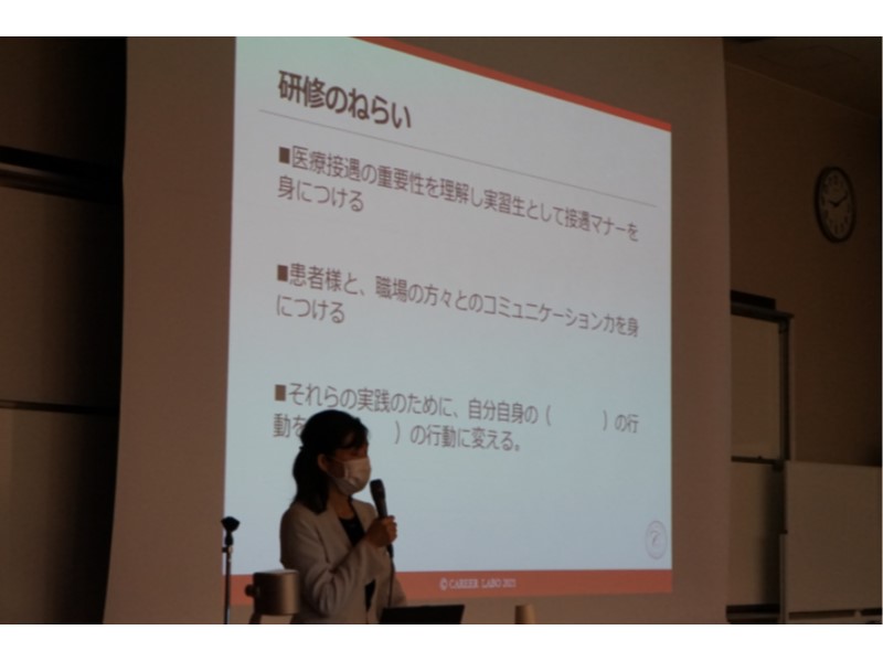 株式会社CAREER LABOの協力を得て、マナー指導のプロ講師から、実習先での身だしなみ、立ち居振る舞いといった基本的マナーからコミュニケーションの取り方について、ロールプレーイングを交えて直接指導を受けました。