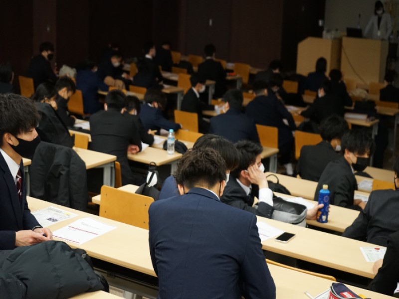 スーツ姿の学生は和やかな雰囲気の中、来るべき実習に備えて真剣に先生の話に耳を傾けていました。