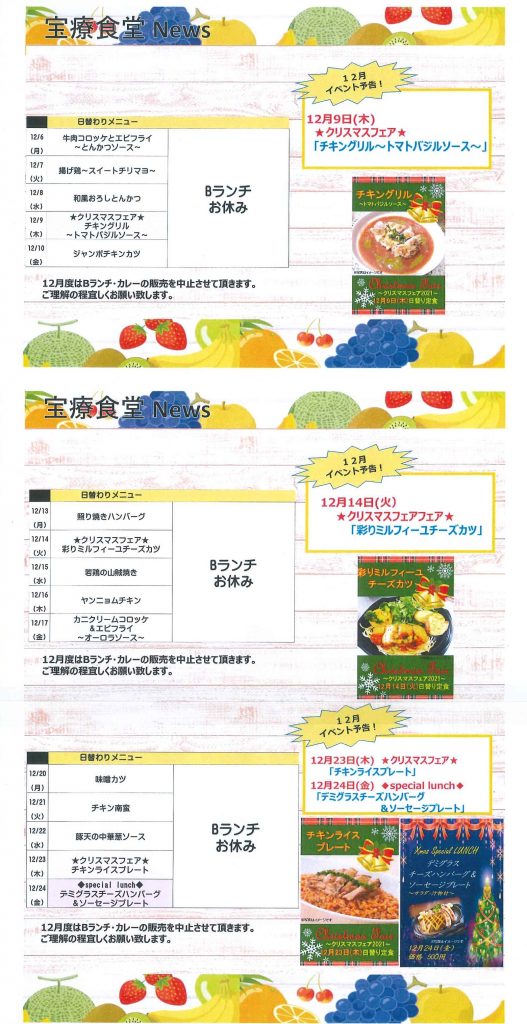 宝療食堂12月のメニューをご案内します。クリスマスメニューが登場しますので是非ご賞味下さい♪