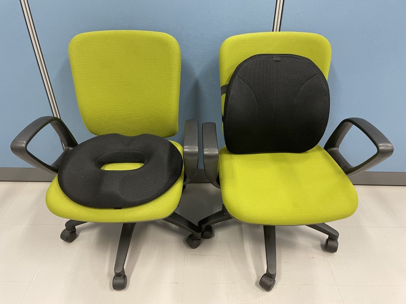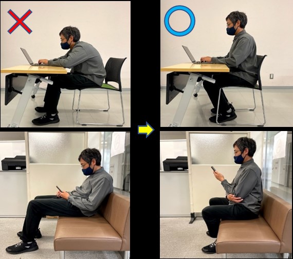 悪い姿勢と良い姿勢の写真をアップしておきます。参考にして下さい。長時間椅子に座ることが多い方は、クッションなどを利用するのもいいかもしれません。