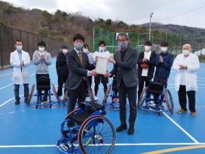 先日、車椅子バスケットボールサークルの活動について日本テレビの取材を受けました。取材では、まず車いすバスケットボール用車椅子の贈呈式が行われ、その後小原統括長、理学3年阪口君、倉田さんのインタビューがあり、練習風景の撮影が行われました。