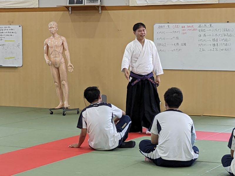 サッカー、柔道、古武道、テーピング、ストレッチ、鍼灸、口腔保健など各学科の協力を得て幅広い内容で講義を行っており、今年度は3年生40名が受講しています。2学期も始まり講義も後半に入りました。楽しみながら、これからも色々なことを学んでいただければと思います。