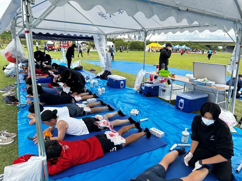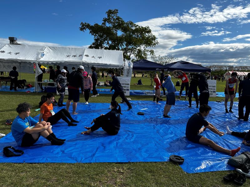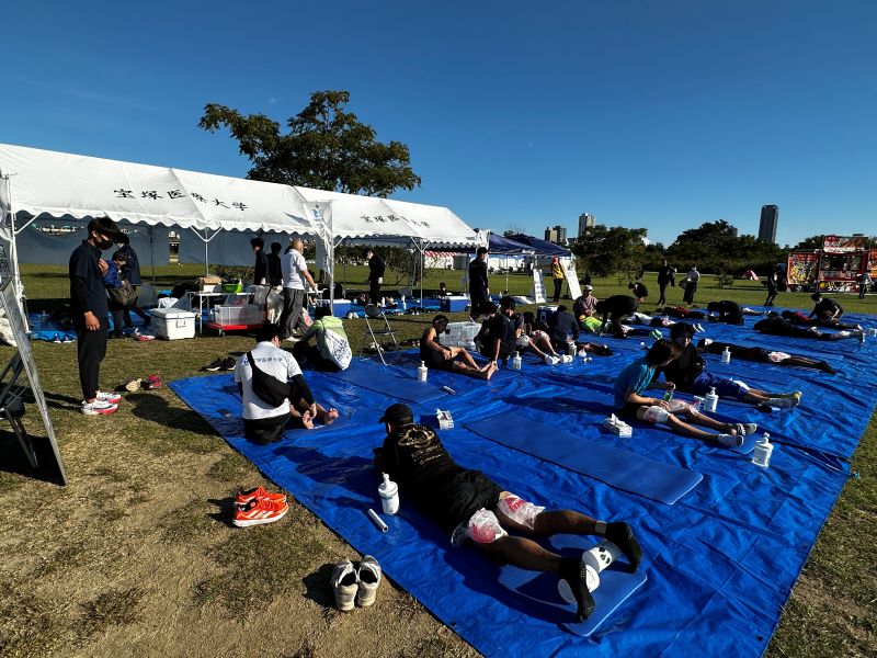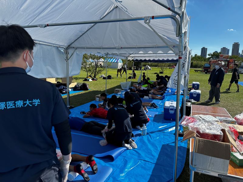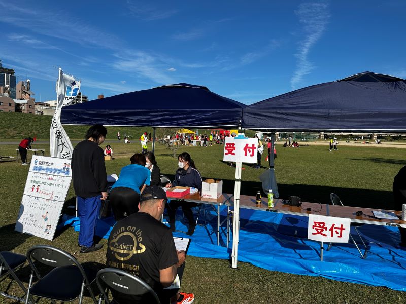 午前7時に会場の淀川河川敷に集合、所定のテントに物品を運び、スポーツケア活動の準備をし、万全の体制で参加ランナーの受入れ態勢を整えました。当日は2日間とも秋晴れに恵まれましたが、1日目は比較的気温が低く、2日目は気温が高いというコンディションでした。フルマラソン、30km、ハーフ、10km、5kmと5カテゴリーに分かれており、2日間で約2300名の参加があり、自己記録を目指すランナーや沿道に手を振りながら走るランナーなど、思い思いのペースで「走り」を楽しんでおられました。