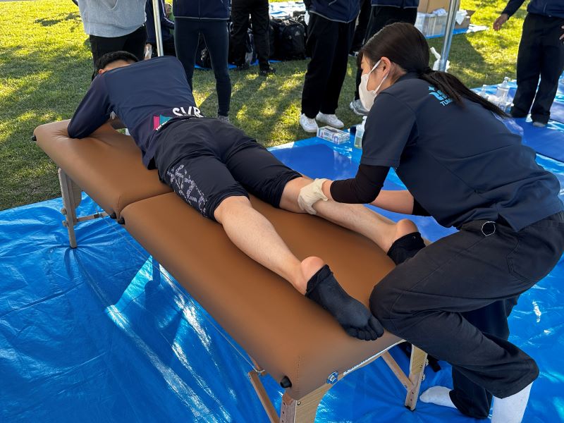 レース前の活動として「ウォーミングアップジェルの塗布」「ストレッチング指導」を、レース後には「アイシング」「クールダウンジェルの塗布」を実施しました。2日間で延べ1,022名の、これまでの利用者数を大きく上回る数のランナーが次々につめかけ、活気にあふれたスポーツケア実習となりました。