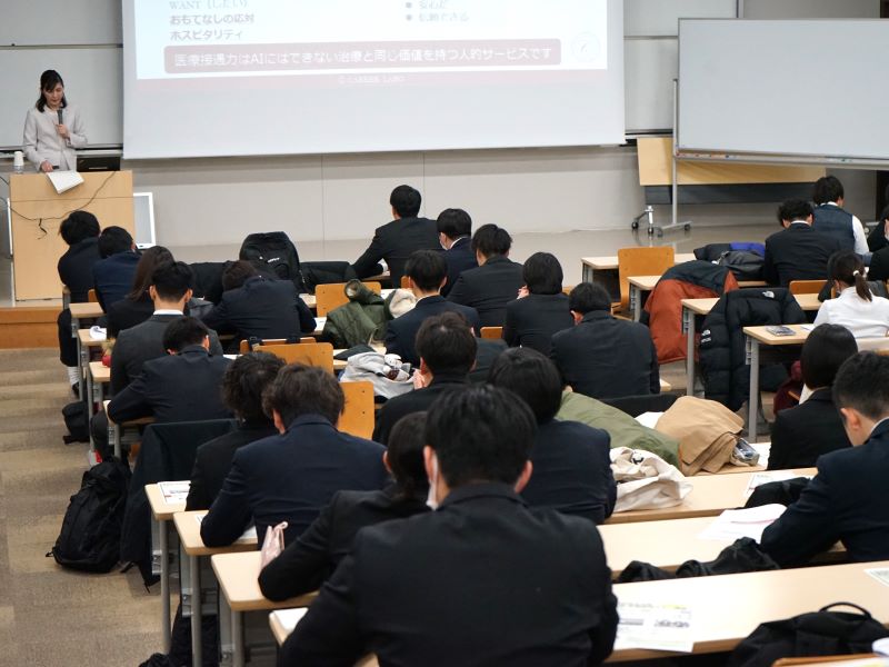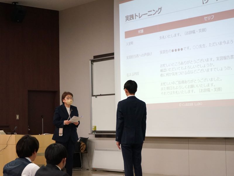 これまで学んだ内容を踏まえて、医療人として働く心構えやマナー、実習中の患者様やスタッフの方々への言葉遣いなどを講師の指導の下、学生同士のペアワークも加えて講座が進みました。