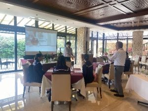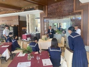 インターンシップ先「シギラベイサイドスイートアラマンダ」では館内見学や模擬授業、テーブルマナー講座、ランチ体験を行いました。