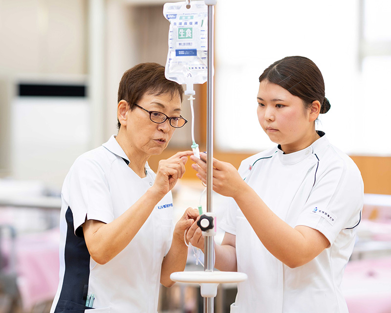 病院、訪問看護ステーション、福祉施設などで、患者様・利用者様を受け持ち、それぞれの状況に応じた適切な看護を行うために必要な基礎的な看護実践能力を修得します。各実習を通じて、患者様・利用者様の発達段階・健康レベルに応じて、安全・安楽・自立を基本とした看護を実践する能力を養います。